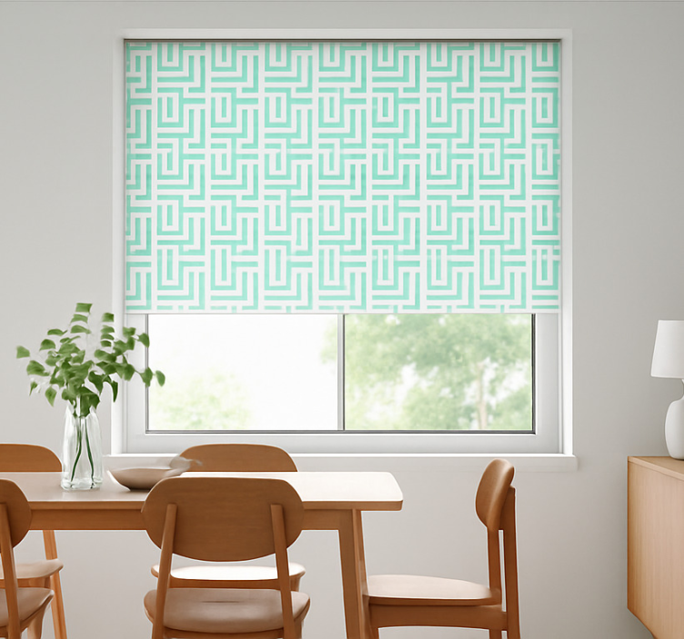 Reference: E5887Transform your space with our Blue geometric squares effect dining room blind, a stunning blend of contemporary design and functionality. This beautiful roller blind features a captivating geometric pattern that adds a touch of sophistication to any dining area. With easy assembly in just two clicks, effortless cleaning, and quick disassembly, you can maintain your windows with ease. This product not only protects your room from direct sunlight but also ensures privacy when lowered, helping you control the room's temperature while enhancing its overall decor!