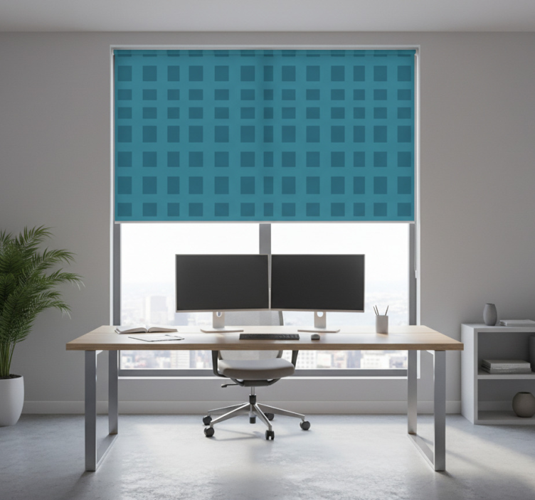 Reference: E6222Transform your workspace with our Home office blind in blue square pattern, a stunning design that combines modern aesthetics with functional elegance. This roller blind features a captivating blue square pattern that adds a dash of creativity to your home office. With easy assembly in just two clicks, and the ability to effortlessly clean and disassemble, this product is perfect for those seeking both style and convenience. It effectively protects your room from direct sunlight, provides privacy when lowered, and helps regulate the room temperature, ensuring a comfortable working environment.