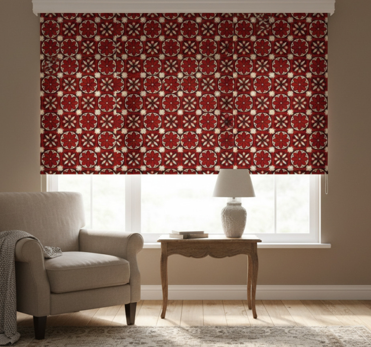 The Red blind with vintage tile design red blind is an exceptional choice for anyone looking to elevate their interior decor! Its eye-catching pattern adds an artistic touch to your living space, while the rich red color infuses warmth and vibrancy into your room. This roller blind not only enhances visual interest but also provides essential privacy and light control, creating a cozy atmosphere for relaxation and enjoyment.
