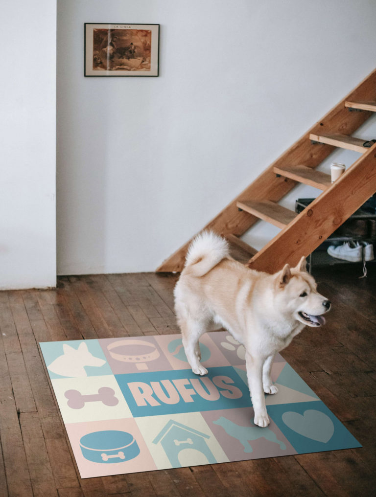 Personalized vinyl rugs for dogs. You can include the name of your pet