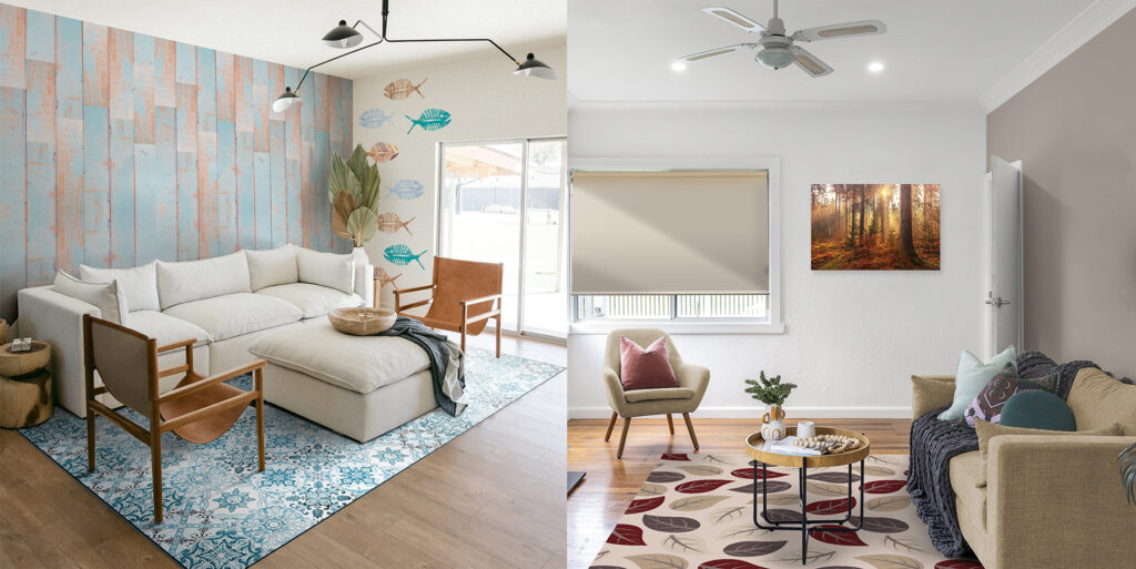 Mediterranean-style tile rug used in the living room in summer. Leaf pattern rug used to decorate the living room in autumn.