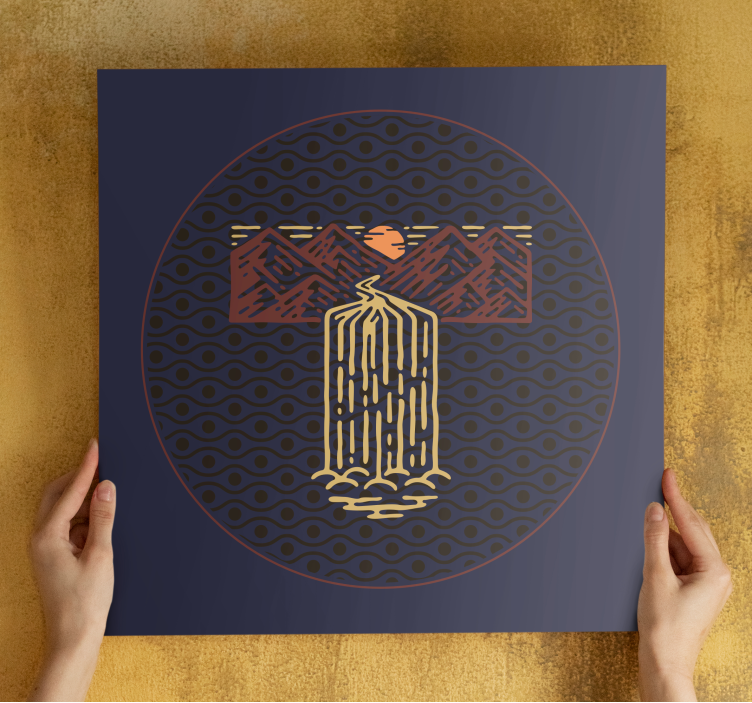 Discover the beauty of nature with our stunning Landscape canvas serene waterfall scene. This art piece captures the essence of tranquility, featuring a mesmerizing waterfall cascading down majestic mountains. The vibrant sun sets behind abstract geometric patterns, blending hues of purple and warm tones, creating a minimalist yet captivating drawing that reflects African influences. The round design encapsulates nature's serenity, offering an inspiring focal point for any space.