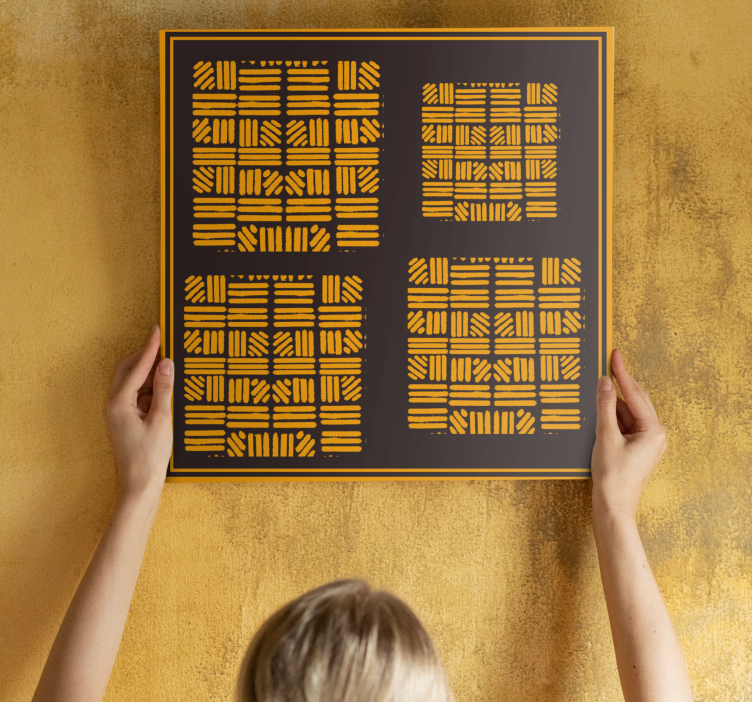 Introducing our stunning modern canvas art geometric design arrangement, a captivating piece that brings life to any space! This artwork showcases a mesmerizing african influence, highlighted by gold and yellow tones that dance along lines and shapes in an abstract form. The intricate geometric patterns create a sense of harmony and balance, making it a perfect addition to your home or office. The framed design enhances the aesthetic appeal, allowing the vibrant colors and grid layout to shine beautifully.