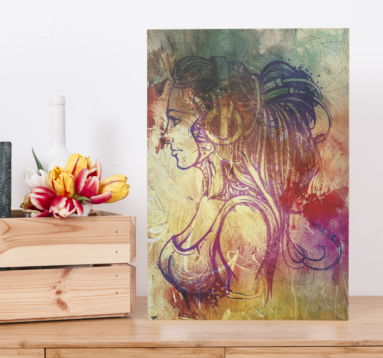 Reference: Q6417A captivating profile silhouette of a woman with flowing hair, intricately illustrated against a textured backdrop. The design captures the essence of femininity while showcasing detailed line work and vibrant splashes of color, creating a harmonious blend of artistry and expression.