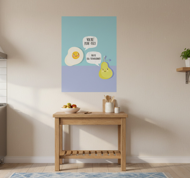 This playful image features a cheerful cartoon-like pear and an egg, both with smiling expressions. The pear declares, 'You're pear-fect,' while the egg responds, 'You're egg-straordinary,' creating a whimsical interaction. The vibrant pastel background enhances the lighthearted atmosphere, perfect for brightening any space.