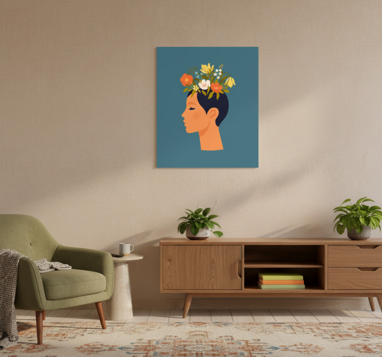 Reference: G968Introducing our stunning Flower poster abstract woman on blue background, a captivating blend of vibrant colors and artistic expression! This unique design features a striking abstract representation of a woman intertwined with floral motifs, set against a soothing blue backdrop. The poster is crafted with a 180g/m2 grammage that enhances its durability, ensuring that the high color intensity and semi-matt finish shine through without reflections, making it a perfect centerpiece for any room.