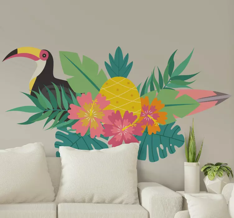 Bring a splash of color and life into your space with our Animal wall sticker tropical bird design. This vibrant design features a stunning toucan surrounded by lush greenery, tropical leaves, and delightful flowers. The colorful palette, highlighted by bright pineapples, creates an inviting atmosphere that will surely uplift any room.