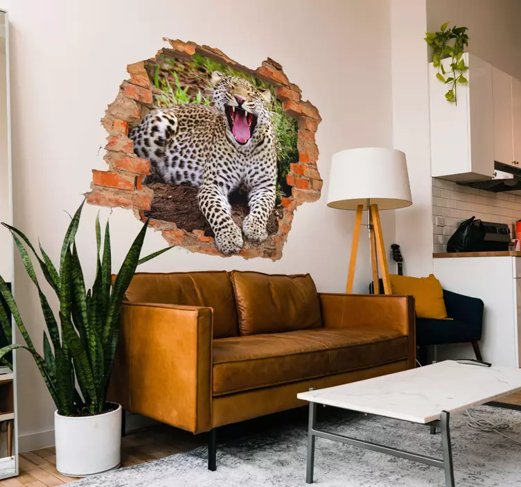 Here is a realistic picture of a cheetah laying on the ground in the jungle. The cheetah is illustrated with a view from a broken brick hole. It's a high-quality graphic print showing the cheetah spot prints and its surrounding with great detail. This 3D cheetah animal wall sticker would surely not go unnoticed in any space decorated on.