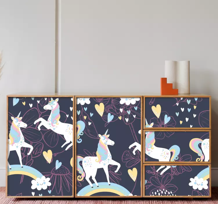 Transform your space with our stunning Blue unicorn pattern furniture sticker! Featuring a delightful design filled with enchanting unicorns, fluffy clouds, vibrant rainbows, charming hearts, and whimsical flowers, this magical pattern adds a touch of fantasy and fun to any furniture. Perfect for creating a dreamy atmosphere, this sticker is sure to inspire creativity and joy in your home.