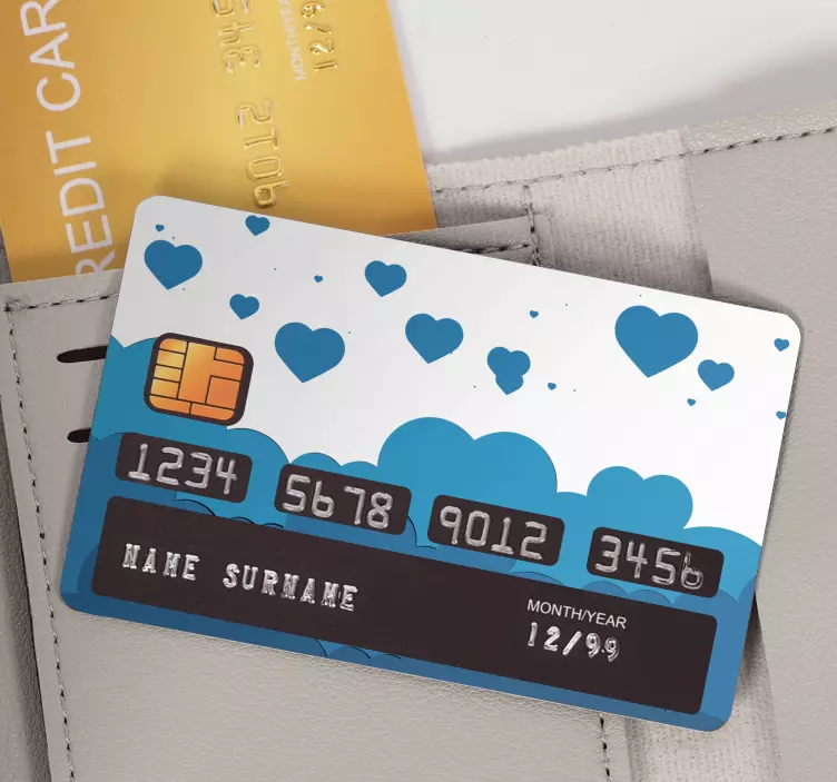 Introducing our adorable Credit card sticker cloud hearts design! This playful sticker features charming hearts nestled among whimsical clouds in a soothing blue palette. Perfectly designed for your credit card, it adds a touch of love and personality to your everyday essentials. Transform your card into a delightful accessory that expresses your unique style!