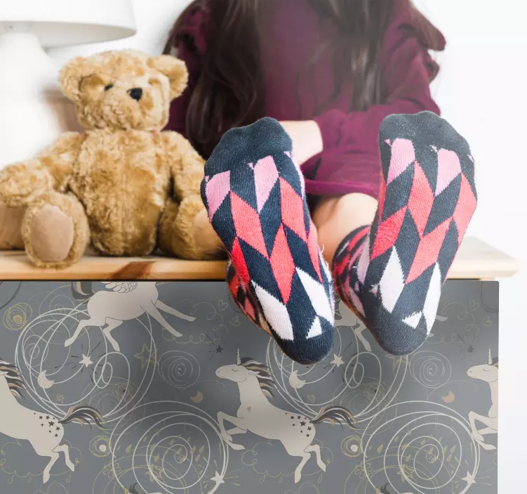 Introducing our Enchanting unicorn pattern furniture sticker, a delightful addition to any child's room! The design features whimsical unicorns and majestic pegasus set against a soothing gray background. With magical swirls and mythical creatures dancing across your furniture, this sticker transforms ordinary spaces into realms of fantasy and wonder that children will adore!