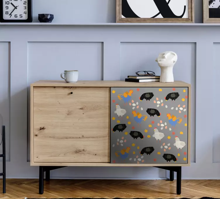Transform your space with our vibrant Farm animal wall sticker farm animals design. This delightful design features an array of colorful farm animals, including playful chickens and other charming creatures, set against a backdrop that resembles a lively farm scene. The whimsical patterns and furniture elements create a joyful atmosphere that is perfect for nurseries, playrooms, or any area that could use a touch of cheerfulness!