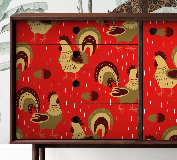 Bring a touch of the farm into your home with our Farm animal wall sticker playful rooster design. This vibrant illustration features delightful roosters set in a colorful pattern, perfect for adding a playful atmosphere to any room. The rich reds and charming farm animal designs will surely brighten up your furniture and bring smiles to all who see it!