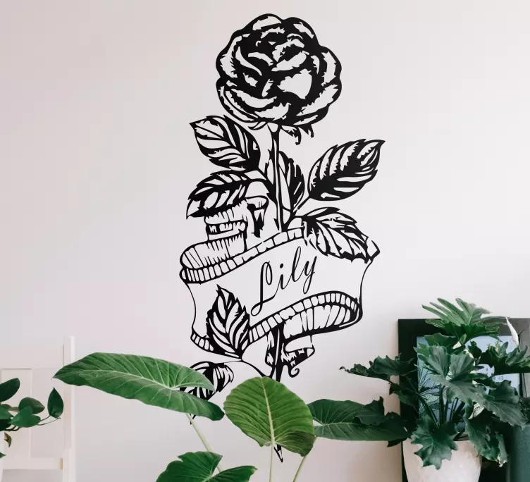 The Flower wall sticker black rose decoration features an exquisite design that beautifully combines a delicate drawing of a black rose with elegant ribbon accents. This stunning piece allows for a custom name to be added, making it a truly personalized touch for your space. With its striking black and white floral aesthetic, it invites the charm of nature into any room, transforming your decor into a serene escape.