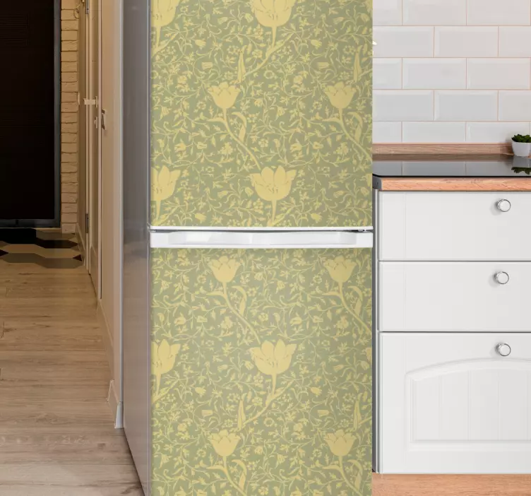 Transform your kitchen into a vibrant oasis with our Fridge sticker floral patterns design. This elegant design features intricate golden floral motifs intertwined with lush green elements and sunny yellow accents, beautifully capturing the essence of nature. Each pattern is thoughtfully crafted to add a touch of charm and sophistication to your fridge, making it a delightful centerpiece in any culinary space.