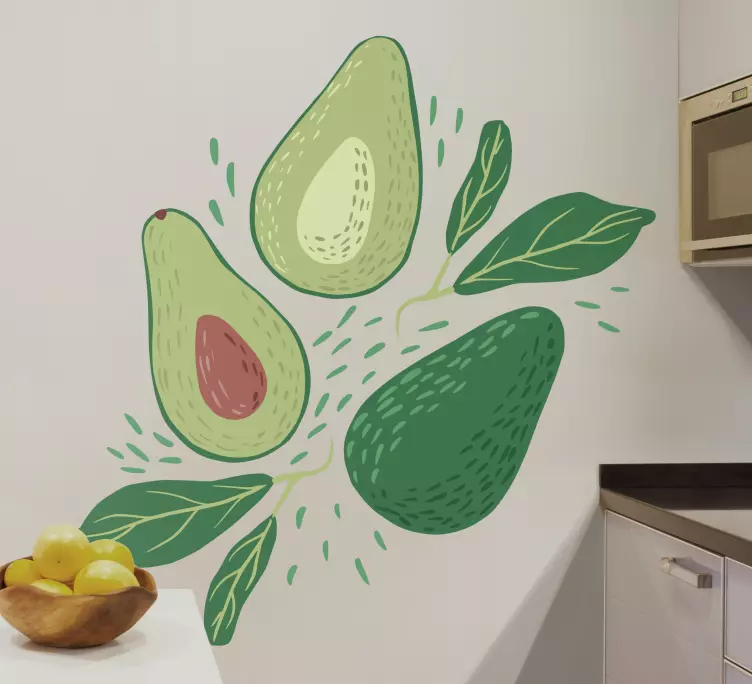 Reference: A49159This vibrant depiction features an arrangement of avocados, showcasing their rich green hues and distinct shapes. The accompanying leaves enhance the natural feel, reflecting a connection to healthy eating and fresh ingredients.