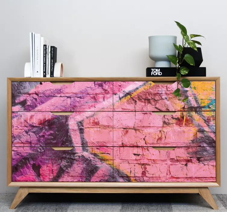 Transform your living space with our Furniture sticker bold colorful vibe, a stunning representation of urban art that captures the essence of graffiti and street art. Featuring vibrant colors, geometric designs, and textures reminiscent of a brick wall, this artistic piece brings a colorful and bold energy to your furniture. The fusion of pinks and other vibrant hues creates a captivating atmosphere, making it a perfect addition to any modern home.