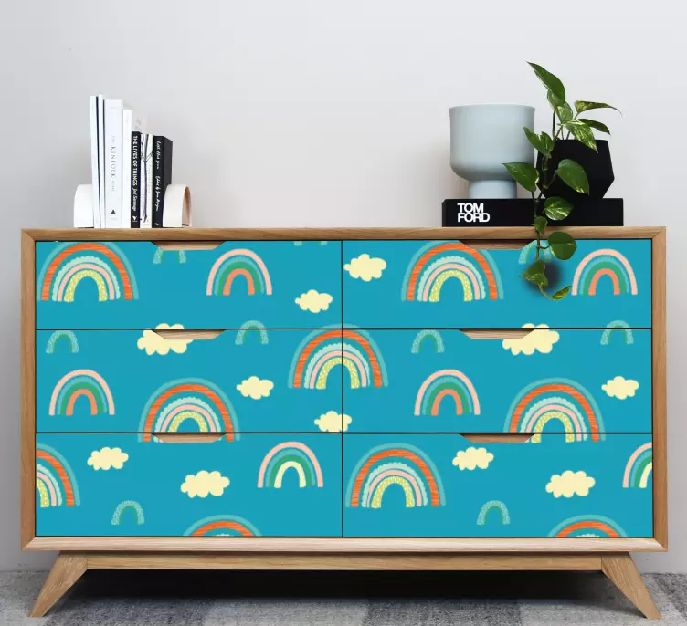Transform your space with our vibrant Furniture sticker colorful rainbow designs, featuring delightful rainbows and whimsical clouds in a playful pattern. This eye-catching design brings a burst of color and joy to any piece of furniture, making it a perfect accent for homes that embrace creativity and fun!