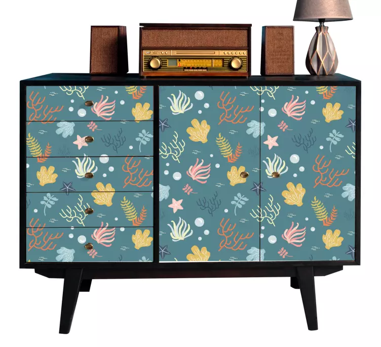 Experience the vibrant essence of the ocean with our Furniture sticker coral reef design. This stunning design features a captivating underwater scene filled with colorful corals, lively sea life, and playful starfish. The intricate pattern showcases the beauty of marine plants and bubbles, transforming your furniture into a piece of art that brings the charm of the ocean right into your home!