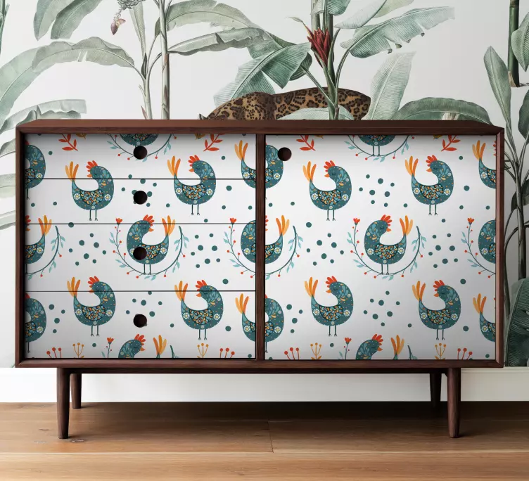 Transform your space with our Furniture sticker lively rooster design! This vibrant design features playful illustrations of chickens and farm animals, intertwined with floral patterns that bring a touch of nature indoors. The colorful design creates a lively atmosphere, making it perfect for adding a cheerful touch to any furniture or wall. Whether you are looking to spruce up your living room or add a fun element to your kitchen, this furniture sticker is sure to delight!