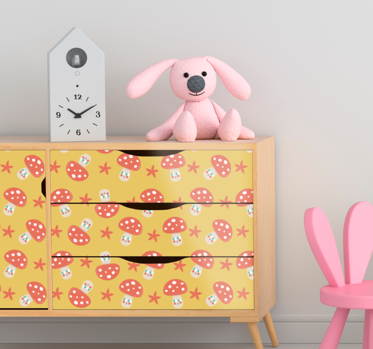 Introducing our delightful Furniture sticker mushroom pattern design, a whimsical creation that brings a playful touch to any space! Featuring charming fly agaric mushrooms and twinkling stars against a vibrant yellow background, this furniture sticker is perfect for children's decor, adding a joyful atmosphere that sparks imagination and creativity.