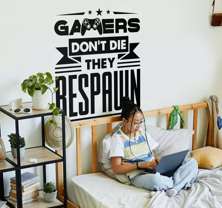 A stylish and catchy mono-color sticker designed specifically for gamers. This video game decal features a caption with a game controller, adding a touch of style to any space. The text on the sticker reads, 'Gamers don't die; they respawn', reminding gamers of their never-ending spirit. Perfect for decorating a gaming room or bedroom, this decal can also be used to add a gaming touch to other areas.