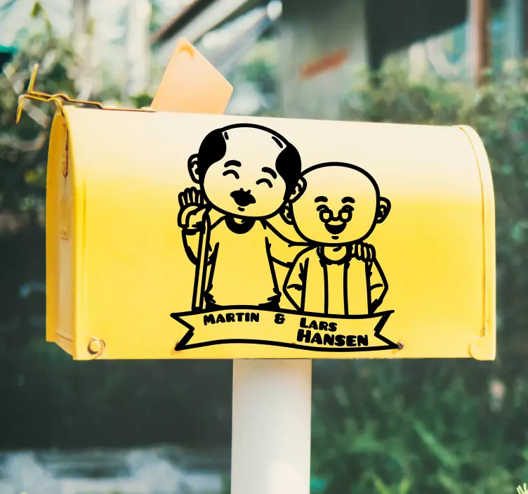 Transform your space with our Home wall sticker cheerful character duo, featuring whimsical and friendly characters that exude love and joy! This delightful design showcases two cheerful men joyfully interacting with a mailbox, bringing a personal touch to your home decor. The customizable nature of this sticker allows you to add your own flair, making it a perfect addition to any room.