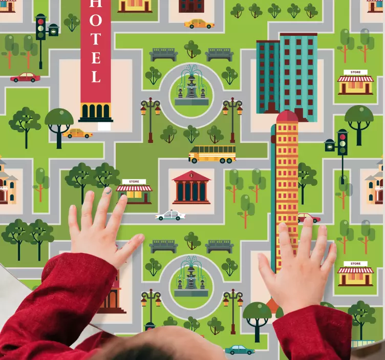 Reference: A49463A vibrant city map featuring intricate details like buildings, trees, stores, and vehicles. It showcases various landmarks, including a hotel and a fountain, encouraging imaginative play and exploration for children, creating an engaging and interactive experience.