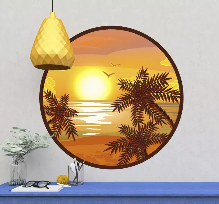 Transform your space with our stunning Nature wall sticker serene sunset view, featuring a beautiful circular design that captures the essence of a tranquil tropical beach. Imagine palm trees swaying gently in the breeze, silhouetted against a vibrant sunset over the serene ocean. This captivating wall sticker brings a piece of nature into your home, creating a calming atmosphere that invites relaxation and peace.