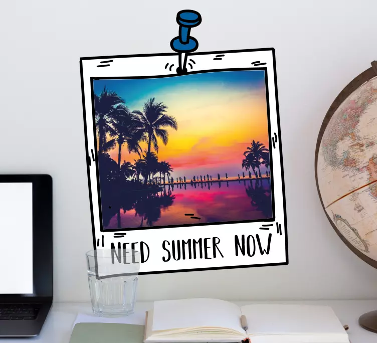 Transform your space with our stunning Nature wall sticker summer landscape frame, which beautifully captures the essence of summer. This design features a captivating polaroid image of a serene beach at sunset, framed by swaying palm trees that evoke the ultimate summer vibes. With the inviting text 'Summer Now,' this photograph brings warmth and joy to any environment, making it a perfect addition to your home or office decor!