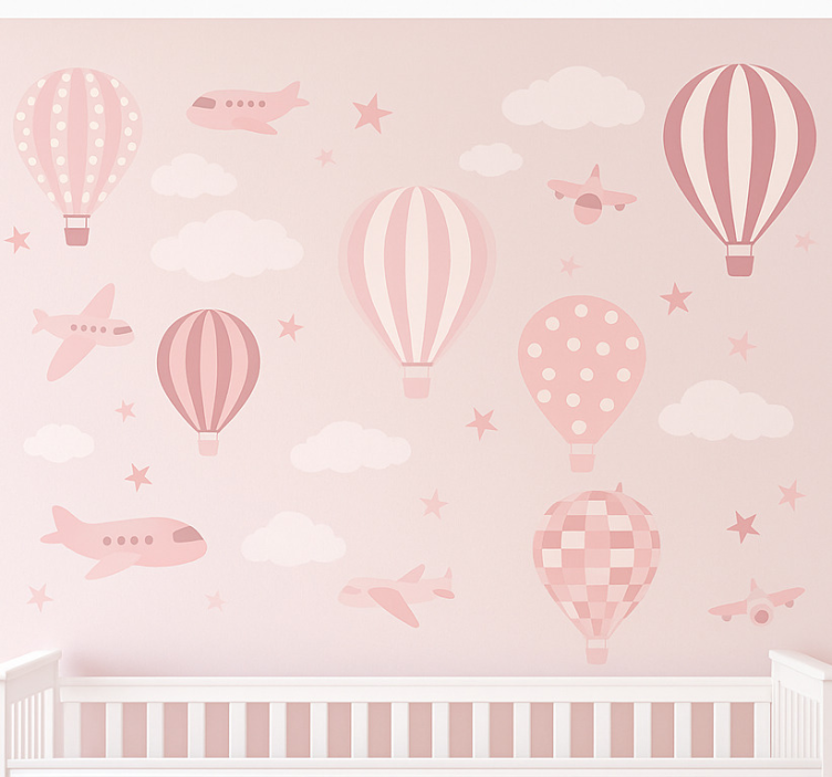 Reference: A54153Transform your little one's nursery with our Nursery room wall decal baby pink aeronautics, featuring whimsical designs of adorable hot air balloons, fluffy clouds, and charming aircraft. This delightful wall decal adds a playful touch to any space, enveloping your nursery in a serene atmosphere that sparks imagination and joy.