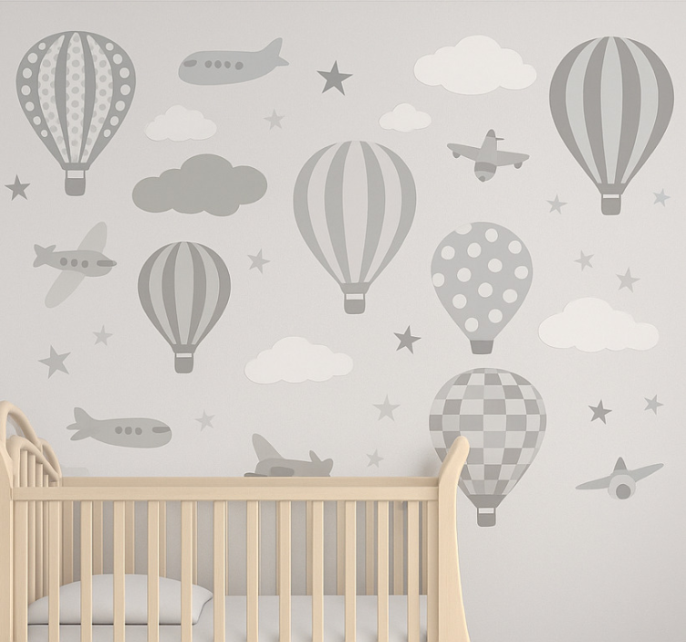 The Nursery room wall decal grey aeronautics design Nursery room wall decal is not just a decoration; it’s a gateway to a world of imagination! This delightful wall decal effortlessly enhances the atmosphere of your baby's room, creating a serene environment where dreams take flight. Allow your little one to gaze at the charming graphics and let their imagination soar beyond the clouds!