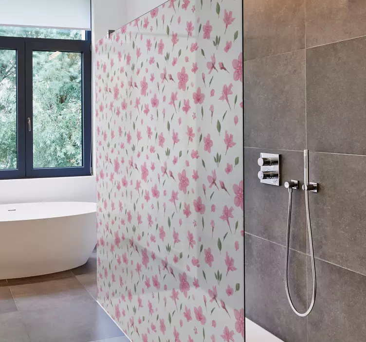 Transform your shower space with our stunning Shower screen sticker botanical design creation. This beautiful design features a delightful blend of watercolour artistry, showcasing pink floral patterns that evoke the enchanting beauty of nature. Adorned with vibrant flowers, this botanical masterpiece effortlessly brings a touch of the outdoors into your bathroom, creating a serene and refreshing atmosphere.