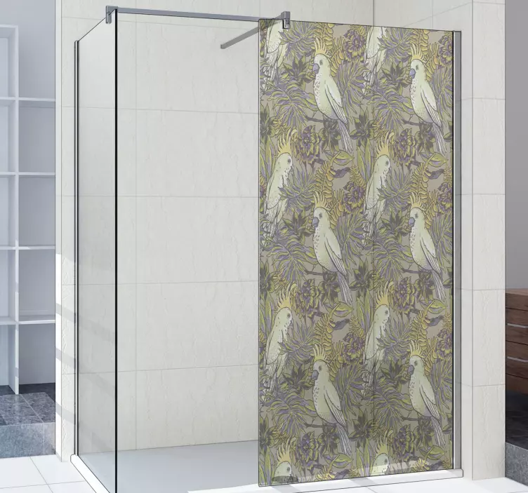 Transform your bathroom into a serene oasis with our Shower screen sticker with elegant bird designs. Featuring exquisite graphical elements such as vibrant parrots, lush leaves, and delicate flowers, this design captures the essence of nature. The elegant patterns of birds and floral motifs harmonize beautifully, creating a decorative touch that enhances any shower screen.