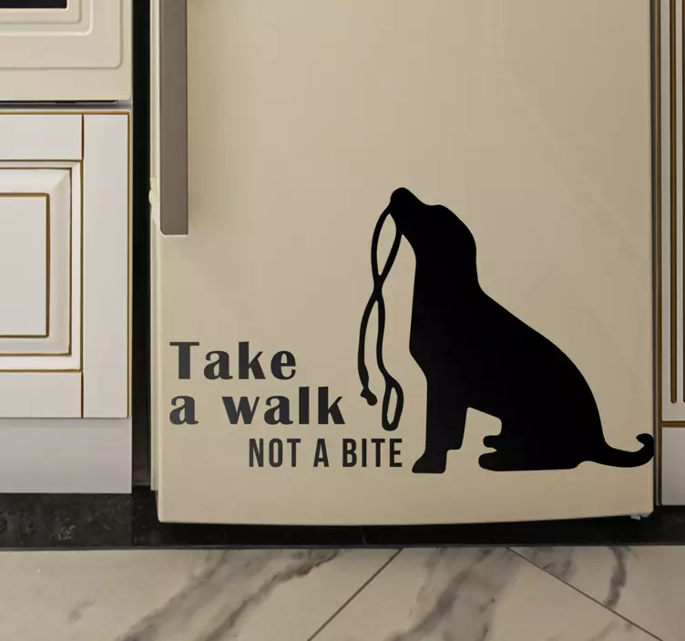 Do you have a pet, specifically a dog? If yes, then you know the dog and leash always go together. Here is an illustration of a dog sitting with a leash in its mouth; the image is captioned with text that reads 'Take a walk, not a bite'—an excellent design idea for dog owners to decorate their space, keeping a connection with their dog.