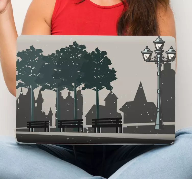 Transform your laptop into a stunning piece of art with our Urban park scene laptop skin. This eye-catching design captures the essence of a vibrant cityscape, featuring 70's silhouettes, charming lamp posts, lush trees, inviting benches, and a beautiful park setting that brings the bustling street life right to your fingertips. Each element harmoniously blends to create a delightful urban scene that inspires creativity and joy!