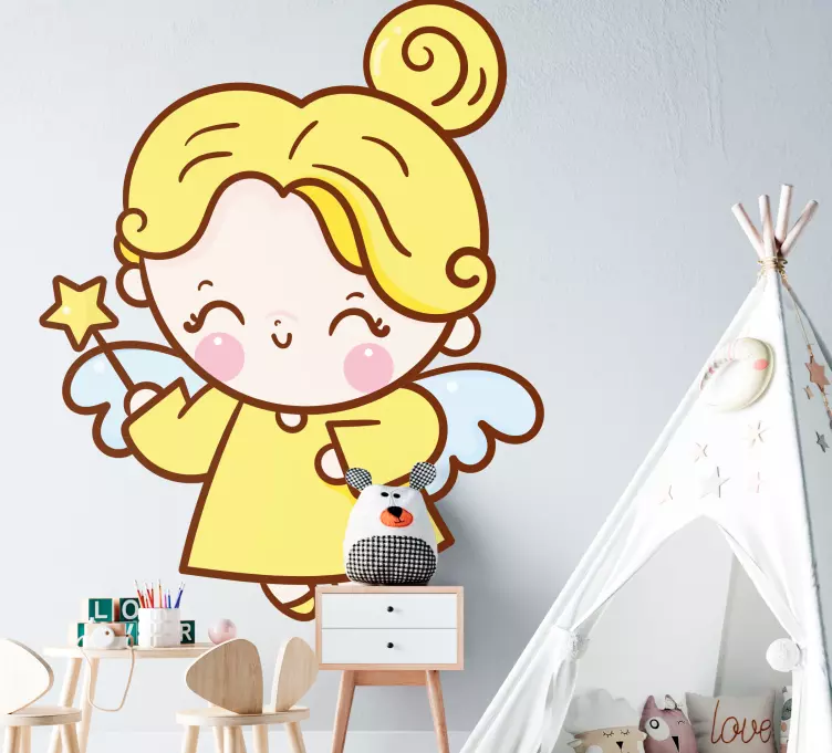 Transform your child's room with our Wall sticker for kids cute angel character, featuring a whimsical design of a smiling fairy angel adorned with a bright yellow wand. This playful character brings a touch of magic and joy, creating a child-friendly atmosphere that sparks imagination and wonder!