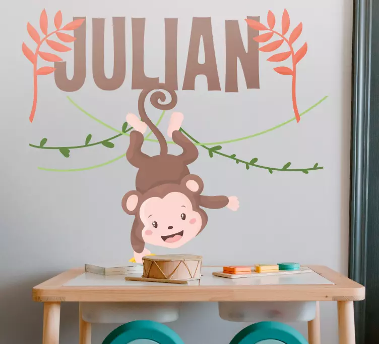 Introducing our Wall sticker for kids cute monkey hanging, a delightful addition to any child's room! This playful design features an adorable baby monkey hanging from a branch, surrounded by vibrant colors and cartoonish elements that spark joy and imagination. The best part? It’s personalizable with your child's name, making it a unique piece of decor that adds a personal touch. Perfect for creating a colorful and playful atmosphere, this wall sticker is sure to bring smiles every day!