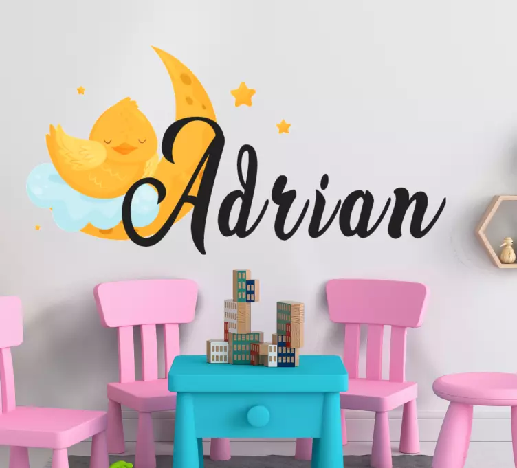 Transform your child's room into a dreamy sanctuary with our Wall sticker for kids cute moon design. This enchanting illustration features a chick nestled beside a serene moon, surrounded by soft clouds and twinkling stars. Personalize it with your little one's name for a truly special touch! This customizable decor piece is perfect for a kids room or childrens room, bringing warmth and charm to their space.