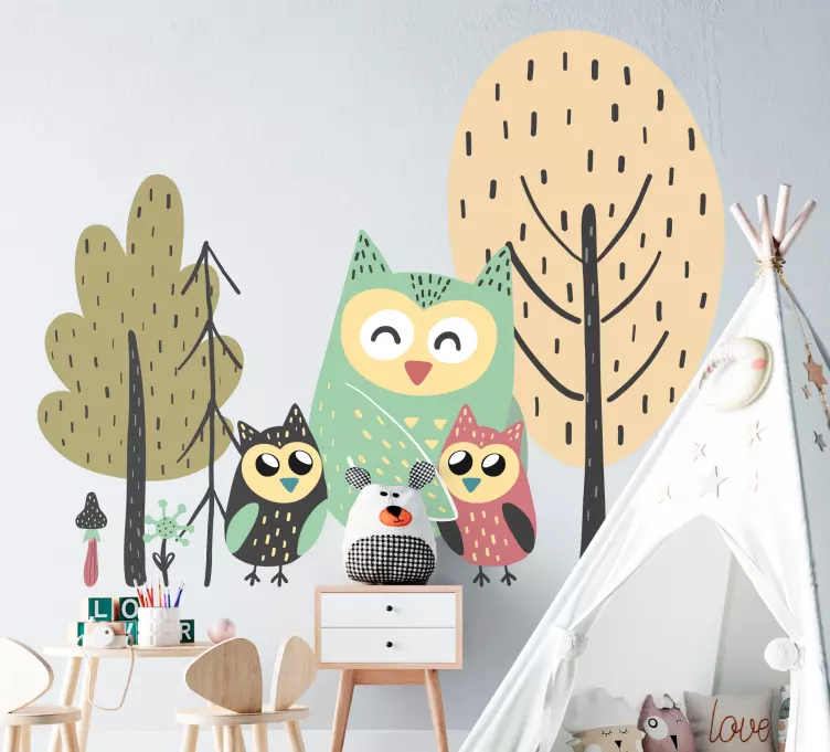 Transform your child's space into a whimsical wonderland with our Wall sticker for kids happy owl family! This delightful design features charming owls perched on trees amidst a backdrop of Nordic-inspired illustrations that celebrate the beauty of nature. The vibrant colors and cute, playful themes make this wall sticker perfect for igniting your child's imagination and creating a joyful atmosphere in their room.