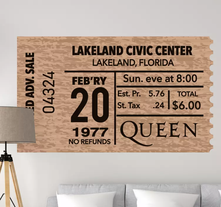 Transform your space with our stunning Wall sticker lakeland civic center ticket! This unique design features a vibrant ticket motif that captures the excitement of a live concert, complete with details like the date, event, and the legendary music of Queen. Whether you're a die-hard fan or just love the ambiance of live music, this wall sticker will bring a dynamic flair to your decor!