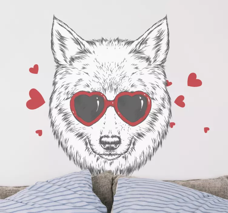 The Wall sticker playful wolf emblem captures a delightful blend of playfulness and charm. This unique design features a wolf wearing stylish sunglasses, surrounded by whimsical hearts. The illustration perfectly balances the essence of this cute animal, making it an eye-catching addition to any space!