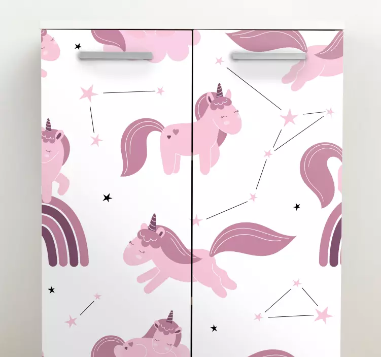 Transform your space with our enchanting Pink unicorn motif furniture sticker! This delightful design features whimsical unicorns frolicking among constellations, vibrant rainbows, and sparkling stars, creating a fantasy world that captivates both children and adults alike. With its charming pink palette and cute patterns, this furniture sticker is perfect for wardrobes and other furniture, bringing a touch of magic to any room!