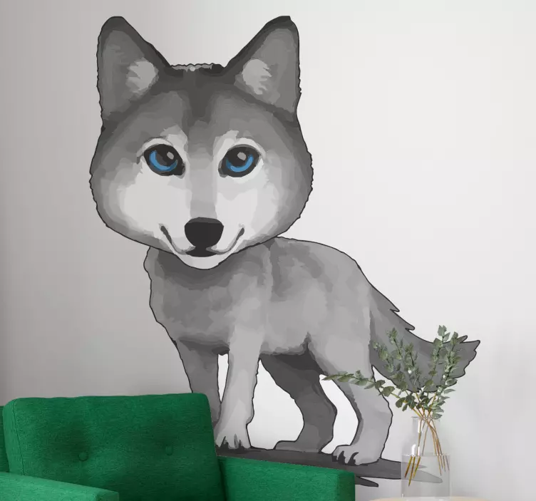 Transform your space with our stunning wolf character illustration wall sticker! This vibrant design features a whimsical cartoon wolf with captivating blue eyes, crafted in a beautiful watercolor style. The playful yet artistic rendering of this animal brings a cute and charming aura to any room, making it a perfect choice for those who appreciate unique decor.