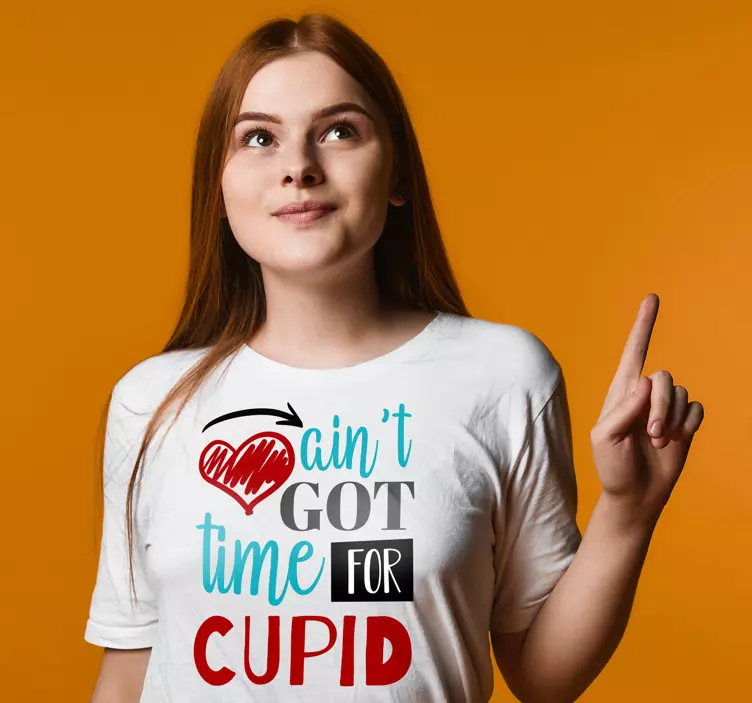 Hey! What do you think about love and cupid, the mythological ancient Roman god of love? This design is a text phrase saying 'Aint got time for cupid.' The text is created in colors and in different font styles and is also featured along with a heart icon.