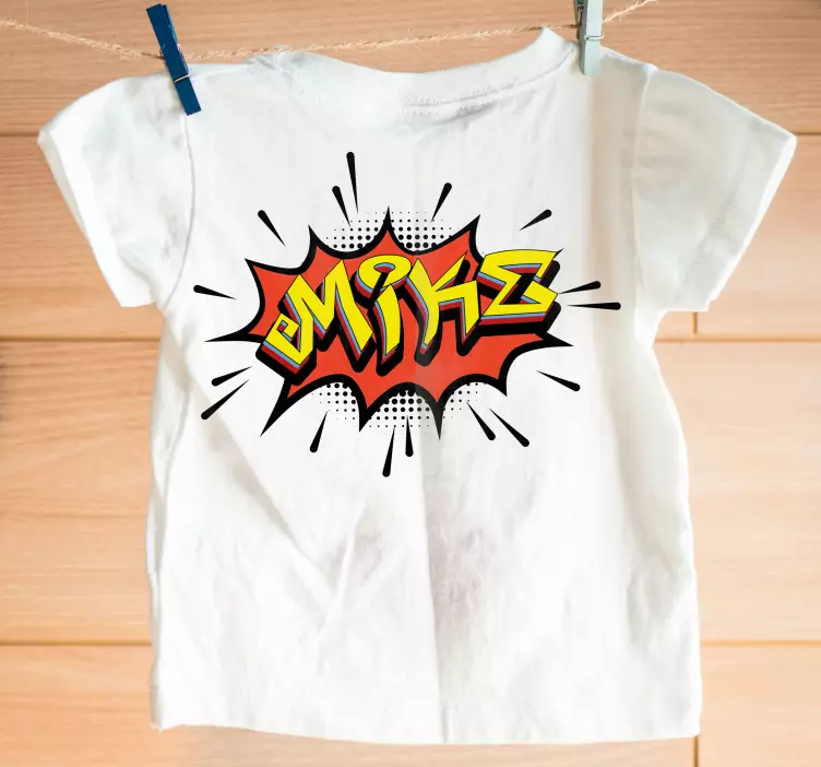 Reference: T4538This playful design features a vibrant comic-style burst with the name 'Mike' prominently displayed. The bold colors and dynamic shapes create an energetic appeal, perfect for a fun and cheerful atmosphere for children.
