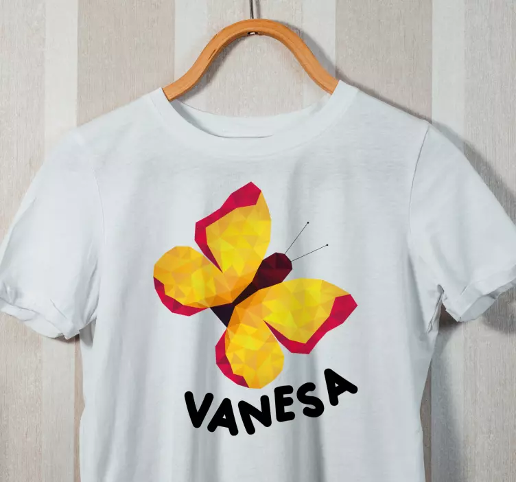 Introducing our delightful Baby t-shirt with vibrant butterfly design! This enchanting shirt features a stunning hand-drawn graphic of a flying polygonal butterfly in bright shades of yellow and red. The whimsical design captures the essence of fun, transforming your little one into a charming little insect enthusiast. With the option for a custom name, this t-shirt is not just a piece of clothing; it's a unique expression of your child's personality!