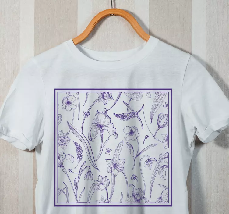Introducing our stunning Botanical motif arrangement t-shirt, a beautiful fusion of nature and art! This t-shirt showcases a captivating design featuring delicate crocus flowers in a rich purple hue, set against a floral pattern background. The intricate illustration brings together the elegance of nature and the charm of a sketch, making it a perfect addition to any wardrobe. With its botanical influences, this t-shirt is an expression of florals and creativity, perfect for those who appreciate the beauty of the great outdoors!