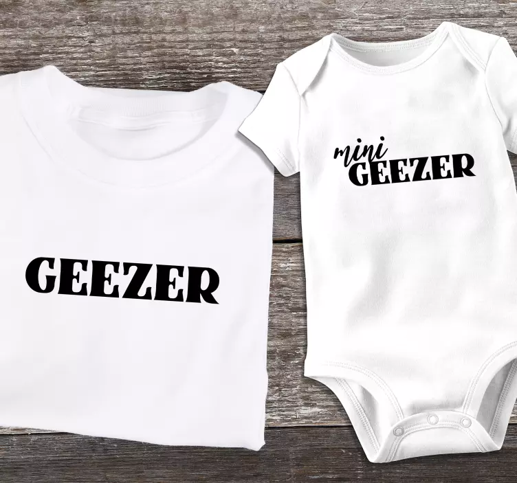 Cockney Geezers Father and son shirt - The shirt has a cool Cockney slang expression for man, bloke ,etc. Its a matching t-shirt for a father and son, it text inscriptions reads ''Geezer, mini Geezer respectively' Legible text lettering, stylish, font with great attention. The colour of the text can be customized, so also is the shirt colour. Original product, premium quality, easy to maintain and a cool addition to closet. The dad and son shirt is available in different sizes for fit, choose the one that suit best and place order.