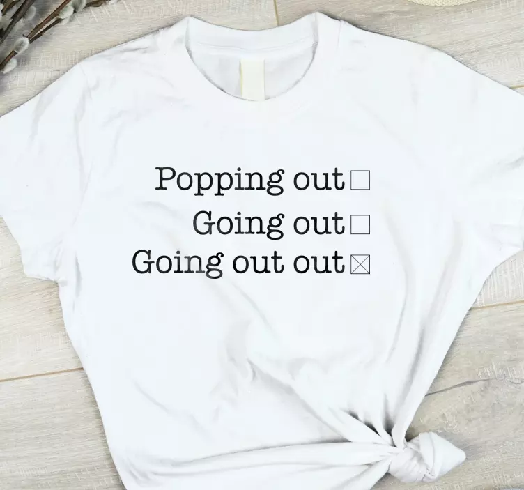 Cockney Going Out custom t-shirt - A cool shirt with Cockney slang expression about going out. It hold three phrases that described how much you want to go out, a funky type of expression. It text reads ''Popping out'' going out' going 'out gout'. Legible text lettering, stylish, it is eye catchy and funky. The colour of the text can be customized, so also is the shirt colour. Original product, premium quality, easy to maintain and a cool addition to closet. The popping out slang t-shirt is available in different sizes for fit, choose the one that suit best and place order.